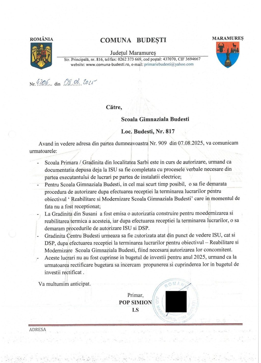 ADRESA: BUDEȘTI, COM. BUDEȘTI, NR. 817, JUD. MARAMUREȘ, CP 437070